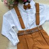 Este conjunto social infantil é a escolha perfeita para deixar os pequenos elegantes e confortáveis em eventos como casamentos, batizados, aniversários, formaturas e cerimônias em geral. Com um visual sofisticado, ele é ideal para quem busca estilo com praticidade. Detalhes do Produto: Camisa social branca de manga longa, confeccionada em microfibra 100% poliéster, com toque macio, caimento leve, clássica e confortável Calça marrom teddy confeccionada em linho 70% poliester, 16% viscose, 11% linho, 3% algodão, com corte reto e caimento sofisticado. Acompanha gravata borboleta marrom, suspensório marrom com regulagem e cinto ajustável marrom e/ou preto com fivela metálica. Itens Inclusos:Camisa SocialCalçaGravata borboletaSuspensórioCinto Calçado não incluso – vendido separadamente. Disponivel em nosso site na categoria calçados meninosAs tonalidades das peças podem variar de acordo com as configurações de tela do seu dispositivo.Para garantir o ajuste ideal, consulte sempre a nossa tabela de medidas antes de finalizar a compra. As medidas podem apresentar 2cm de variações conforme o lote de fabricação.