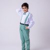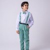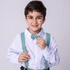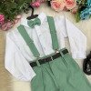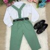 TECIDO CAMISA SOCIAL MANGA LONGA : MICROFIBRA 100%TECIDO DA CALÇA: 70% POLIESTER, 16% VISCOSE, 11% LINHO,3%ALGODÃO   Conjunto composto por: Camisa Social na cor Branca, Gravata Borboleta na cor verde, Cinto na Cor preto,Suspensório e Calça na cor verde. Demais peças ou acessórios, não inclusos.   BATIZADO,PAGEM,NOIVINHO