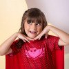 Fantasia Temática Corujita – PJ Masks   A fantasia perfeita para transformar a brincadeira em uma verdadeira aventura! Inspirada na personagem Corujita, do desenho PJ Masks, esse modelo traz charme, conforto e diversão para as pequenas heroínas. Detalhes do Produto:   Fantasia temática da Corujita. Modelo em macacão curto com estampa que imita as escamas da personagem. Capa vermelha embutida destacada, ideal para dar movimento e completar o visual. Acompanha máscara temática Corujita para a criança entrar de vez no personagem.   Confeccionado em tecido ELENCA gramatura 320 – 100% Poliéster, garantindo caimento perfeito e resistência. Produto delicado, exige cuidado tanto no uso quanto na lavagem (somente lavagem à mão, nunca em máquina)  Informações Importantes As medidas podem variar em até 2cm. Recomendamos sempre consultar a tabela de medidas antes da compra para evitar erros. Cuidado ao vestir: não forçar a entrada ou puxar o tecido, pois pode esgarçar a costura ➝ Não realizaremos troca por mau uso. Tiara e outros acessórios não acompanham o produto, mas estão disponíveis em nosso site. Calçado vendido separadamente, disponível na categoria Calçados. As cores do produto podem sofrer variações de tonalidade conforme a configuração da tela do seu dispositivo.