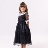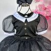 Fantasia Infantil Vandinha – Wandinha Apresentamos a Fantasia Infantil Wandinha, um modelo inspirado no estilo marcante da personagem mais querida da Família Addams. Esse vestido longo traz a essência gótica em uma versão delicada e sofisticada para as pequenas fashionistas. Detalhes do Produto Vestido preto com saia longa em tule leve e brilho sutil; Parte superior com gola branca clássica e botões frontais, remetendo ao estilo original da Vandinha; Mangas em tule transparente com acabamento moderno; Modelagem confortável que garante liberdade de movimentos.Informações Importante As medidas podem variar em até 2cm. Recomendamos sempre consultar a tabela de medidas antes da compra para evitar erros. Cuidado ao vestir: não forçar a entrada ou puxar o tecido, pois pode esgarçar a costura ➝ Não realizaremos troca por mau uso. Tiara e outros acessórios não acompanham o produto, mas estão disponíveis em nosso site. Calçado vendido separadamente, disponível na categoria Calçados. As cores do produto podem sofrer variações de tonalidade conforme a configuração da tela do seu dispositivo.