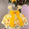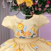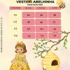 Destaques do modelo:      • Estampa lúdica com abelhinhas sorridentes, colmeias e flores amarelas, transmitindo delicadeza e diversão.      • Mangas e saia rodada para um visual encantador.      • Cinto com detalhes e laço volumoso nas costas, garantindo um charme extra e um ajuste impecável.      • Lastex nas costas para mais conforto e flexibilidade.      • Acabamento cuidadoso com cores vibrantes e detalhes realistas nas estampas. Atenção: As medidas podem variar em até 2cm. Recomendamos sempre consultar a tabela de medidas antes da compra para evitar erros. Para um volume extra, indicamos o uso de saiote de armação, vendido separadamente na categoria acessórios. Tiara e outros acessórios não acompanham o produto, mas estão disponíveis em nosso site. Calçado vendido separadamente, disponível na seção de calçados.As cores do produto podem sofrer variações de tonalidade conforme a configuração da tela do seu dispositivo.